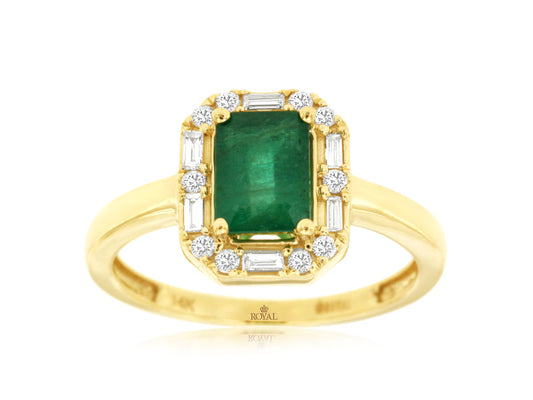 A vibrant emerald cut emerald (1.00ctw) garnishes this classic gemstone ring. Nestled within a halo...