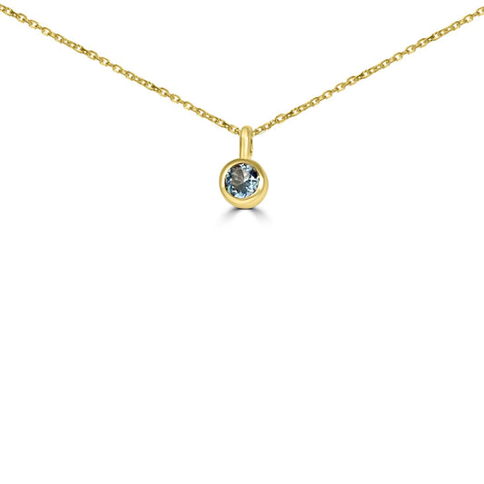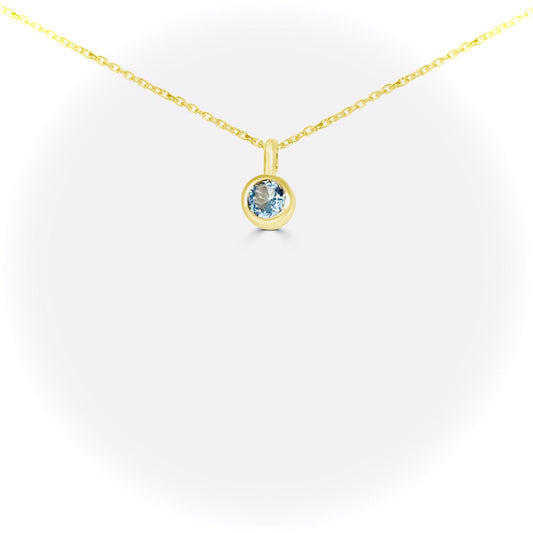 This elegant 14K Yellow Gold necklace features a stunning 4mm round aquamarine stone, beautifully set...