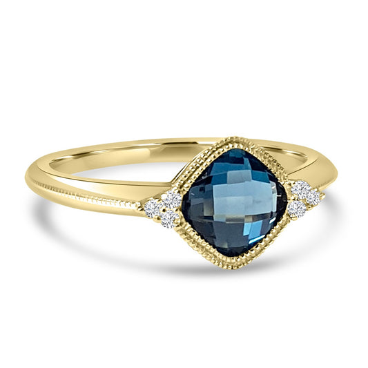 This exquisite 14K Yellow Gold Bezel Set London Blue Topaz Ring features a stunning cushion-shaped...