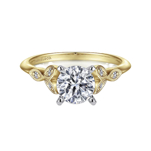 The dainty leaf motif split shank on this 14K yellow gold oval shape engagement ring...