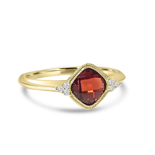 This stunning 14K Yellow Gold Bezel Set Garnet Ring features a vibrant cushion-shaped garnet stone...