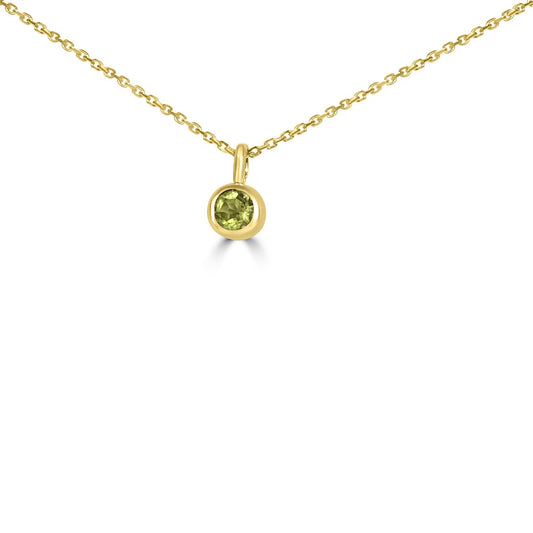 This elegant 14K Yellow Gold 4MM Bezel Peridot Necklace features a stunning round peridot gemstone,...