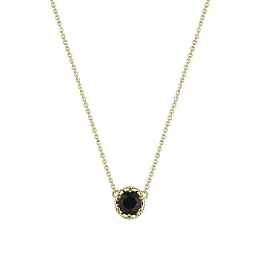 Petite Black Onyx gems are set in a yellow gold crescent basket, for a sweet...