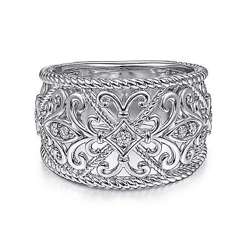 This wide band ring contains a multitude of textures and finishes. Layered strands of polished...