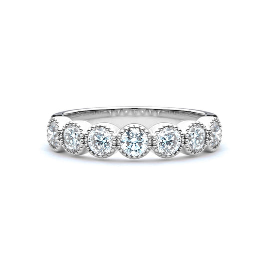 Crafted in 14k white gold, this semi eternity diamond wedding band features nine round diamonds...