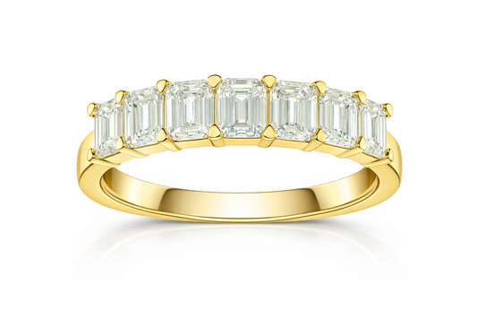 Vibrant and elegant, this 14K yellow gold band showcases alternating emerald-cut emeralds and emerald-cut diamonds...