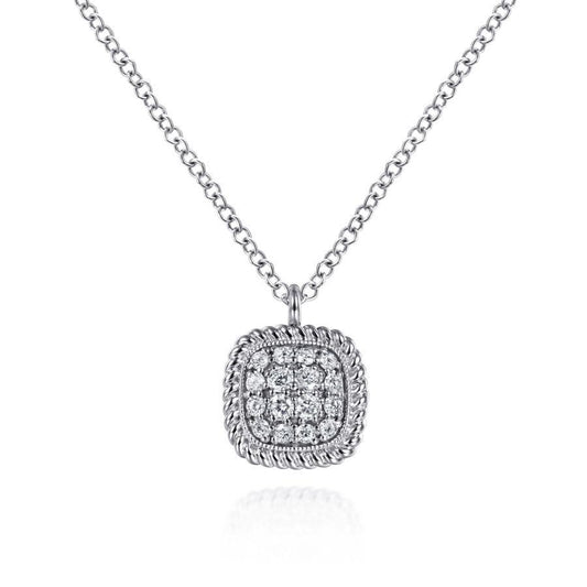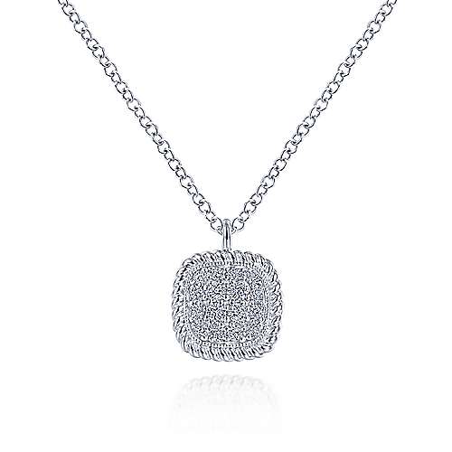 Pure perfection. A beautiful pave diamond cushion shaped pendant rests gently within a vibrant white...