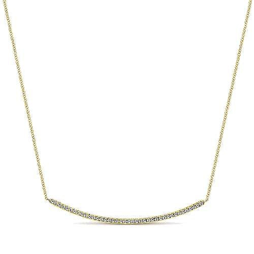 This tasteful 18" yellow gold fashion necklace features a single curved bar of sparkling diamonds