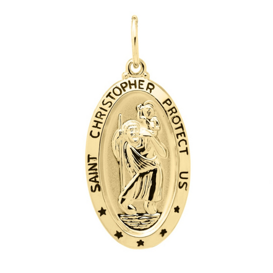Exhibit your faith and fashion simultaneously with this large gold filled round St. Christopher's medal...