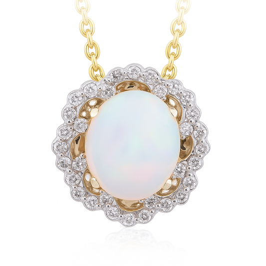 A brilliant 0.12ct pave diamond halo encircles this vintage inspired styled opal necklace. The vibrant...