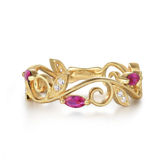 A timeless stackable ring with a sleek filigree vine pattern and glamorous rubies. Crafted from...