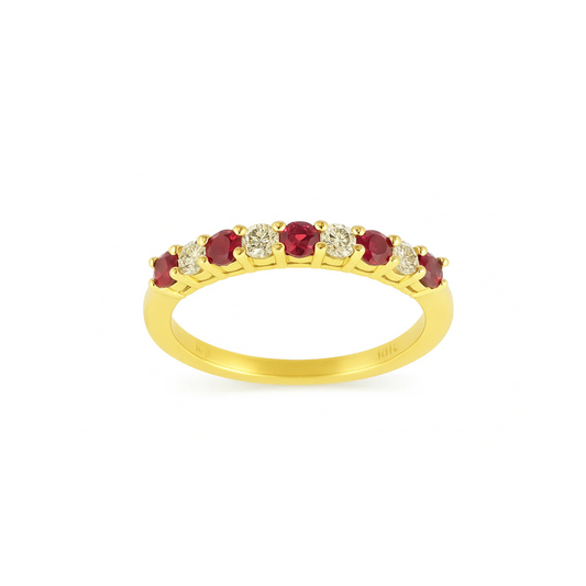 A timeless blend of elegance and vibrant color, this 14K yellow gold band features five...