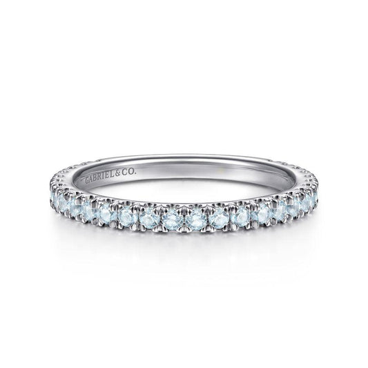 A timeless stackable ring with a sleek straight silhouette and dozens of vivid sky blue...