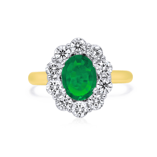 The oval emerald in halo of round diamonds, set atop a thin gold band is...