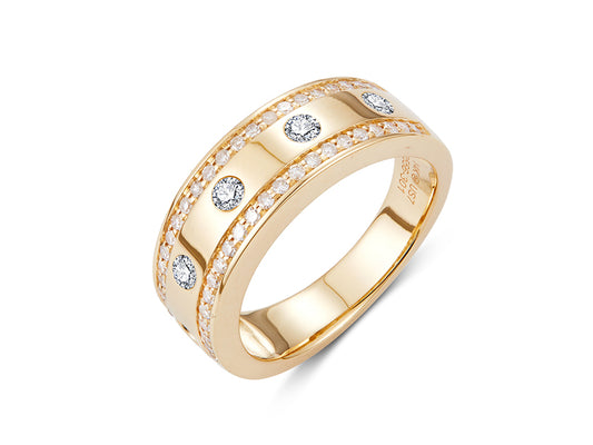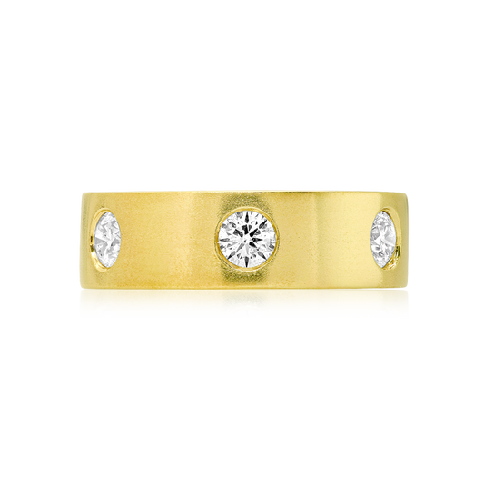 Five sparkling round diamonds are spaced along a polished gold surface and hugged by two...