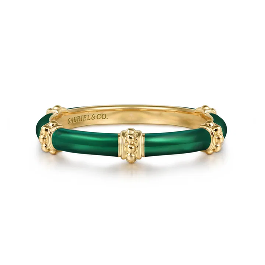 This stackable ring is embellished by Garnet gemstones that compliment the 14k yellow gold band.