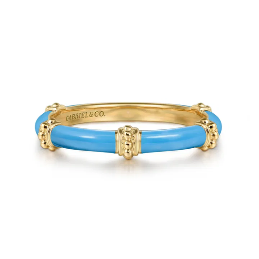 A timeless stackable ring with a sleek straight silhouette and dozens of vivid sky blue...