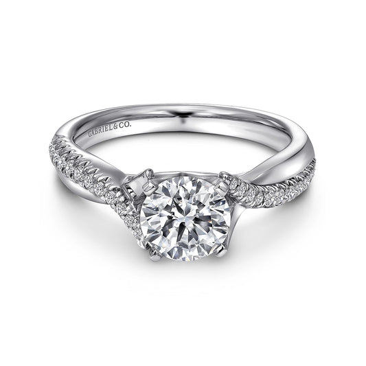 This stunning 14K white gold engagement ring is designed to showcase a breathtaking 9mm round...