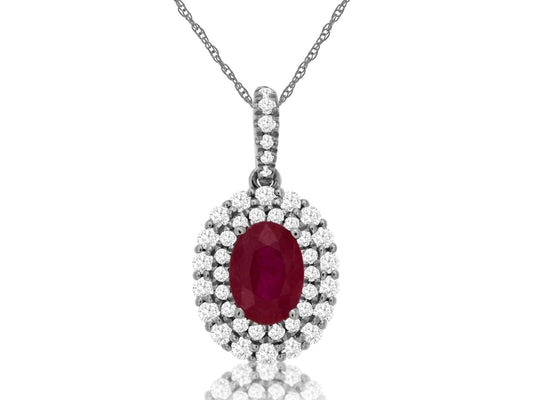 A .39ct pave diamond double halo encircles this classically styled ruby gemstone necklace. The vibrant...
