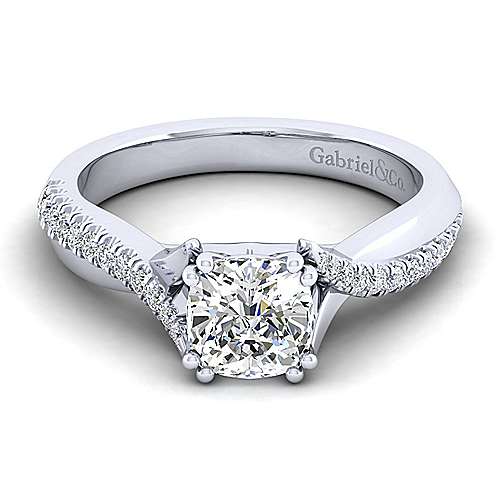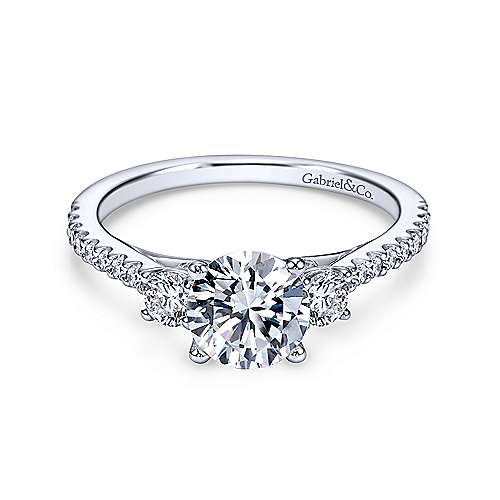 Gabriel & Co. fabulous three-stone engagement ring has graceful diamonds in the gallery that link...