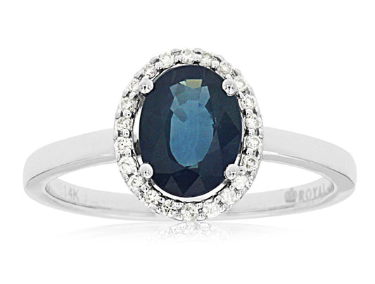 A vibrant oval cut sapphire garnishes this classic September birthstone ring. Nestled within a halo...