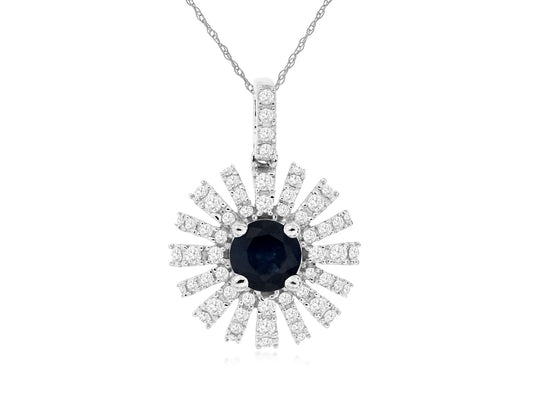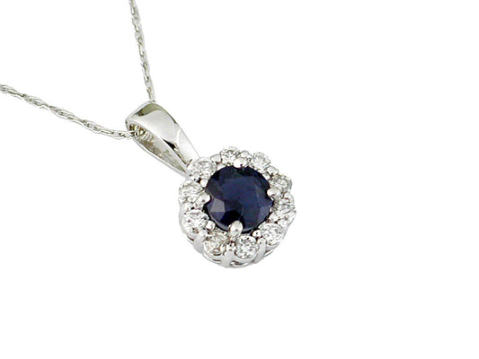 A brilliant 0.30ct pave diamond halo encircles this classically styled sapphire necklace. The vibrant September...