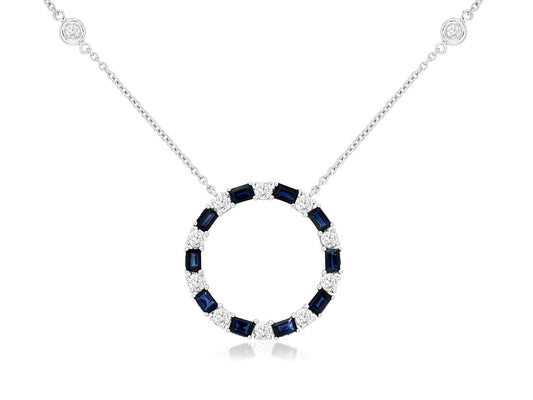 Sapphire baguettes and round diamonds form this stunning September birthstone necklace! Crafted from 14k white...