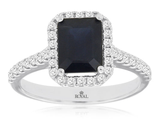 A 1.85ct emerald cut sapphire is the star of this ring! Featuring a pave diamond...