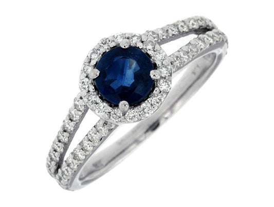 A vibrant round cut sapphire garnishes this classic September birthstone ring. Nestled within a halo...