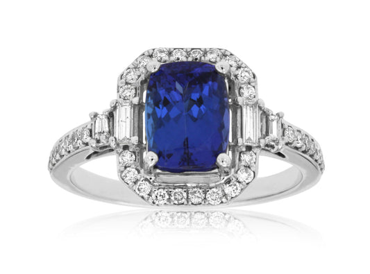 A vibrant cushion cut tanzanite (1.60ct) garnishes this classic gemstone ring. Nestled within a halo...