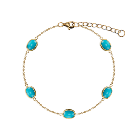 A vibrant touch of elegance, this 18K yellow gold bracelet showcases five oval turquoise gemstones...