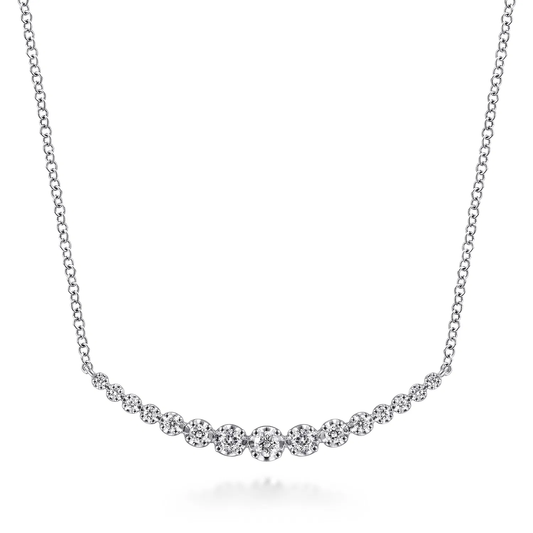 Add a touch of modern sophistication with this 14K white gold graduated diamond curved bar...