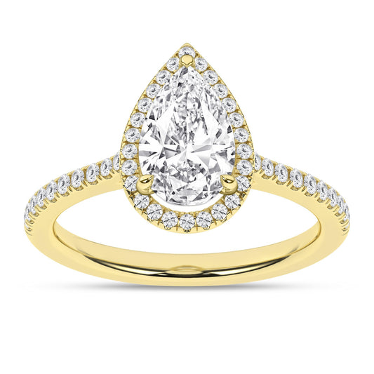 Designed to dazzle, this breathtaking engagement ring showcases a 2.01 carat lab grown pear-shaped diamond...