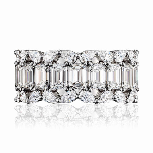 Emerald and pear-cut diamonds are hand set in a dazzling mosaic around a premium metal...