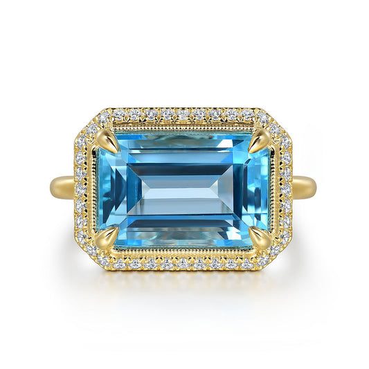 This stunning 14K Yellow Gold Diamond and Blue Topaz Emerald Cut Ladies Ring is a...