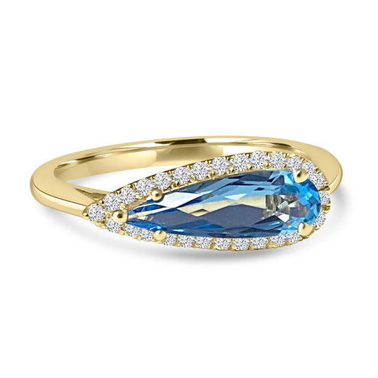 This stunning 14K Yellow Gold ring showcases a captivating pear-cut blue topaz, expertly set horizontally...
