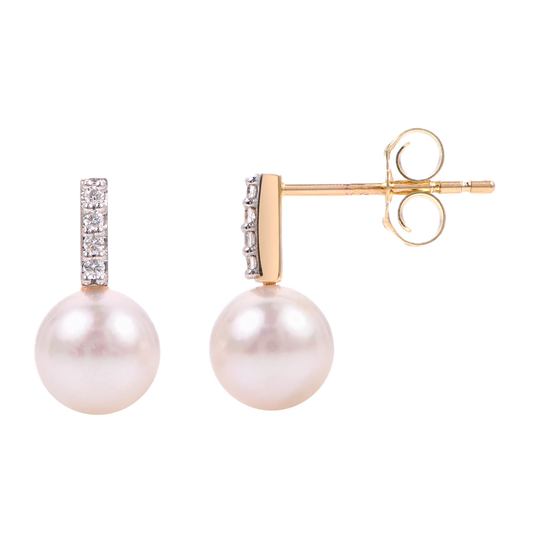 Modern elegance meets timeless beauty in these 14K Yellow Gold Akoya Pearl and Pavé Diamond...