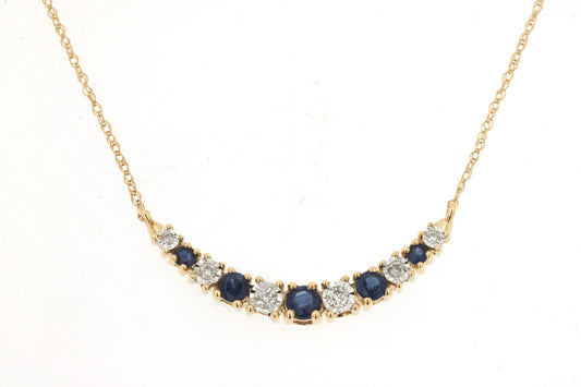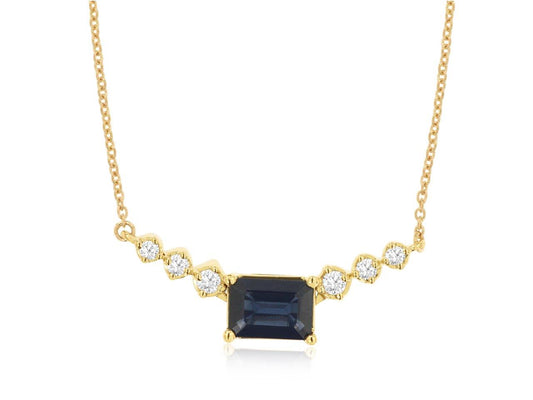 Elevate your look with our exquisite 14K Yellow Gold Sapphire and Diamond Curved Bar Necklace....