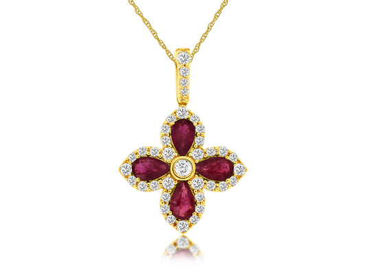 Four lush, pear red rubies (.90ctw) are set in a clover design. Enhanced with 0.40cts...
