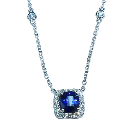 A brilliant 0.30ct pave diamond halo encircles this classically styled sapphire necklace. The vibrant September...