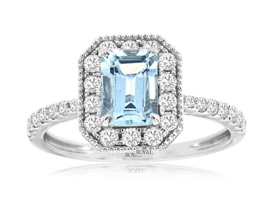 Dive into sophistication with this stunning 14K White Gold Aquamarine and Diamond Halo Ring. The...