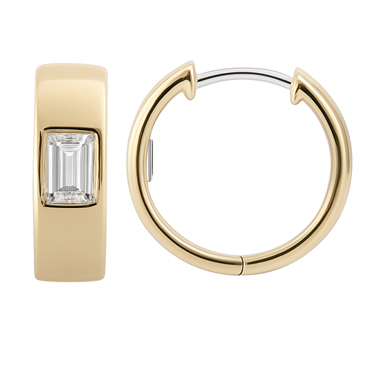 Sleek and sophisticated, these 14K yellow gold huggie earrings feature a single baguette-cut diamond at...