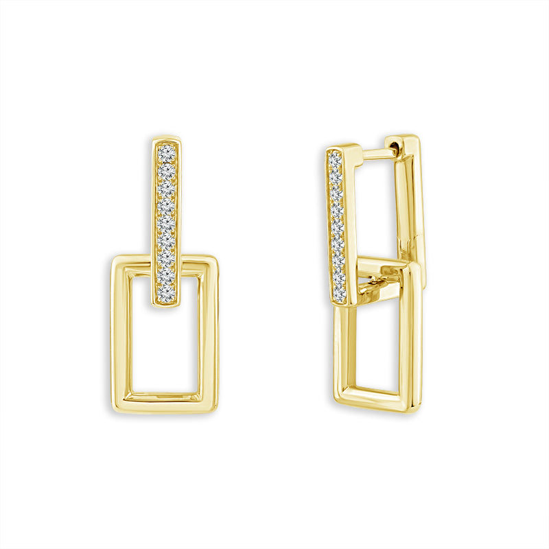 Modern lines meet everyday sparkle in these double-rectangle huggies. Crafted in 10 karat gold, each earring features a sleek polished rectangle paired with a pavé-set diamond bar for a combined 1/5 carat total weight. The geometric silhouette gives these huggies a fresh, contemporary feel while still remaining lightweight and comfortable for all-day wear. Perfect for adding a hint of shine to your daily rotation or stacking with your favorite studs for a stylish layered look.