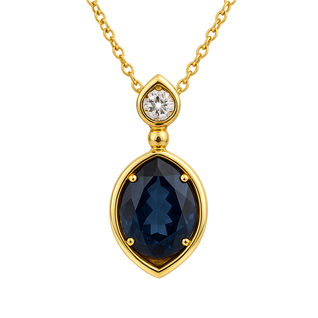 Timeless and elegant, this 14KT yellow gold teardrop necklace features a stunning 1.38ct pear-shaped sapphire framed in a smooth bezel for a rich, refined look. Above it rests a brilliant .11ct round diamond, adding the perfect touch of sparkle and balance. Suspended from an 18" chain, this pendant blends classic gemstone beauty with modern sophistication—an effortless statement piece for any occasion.