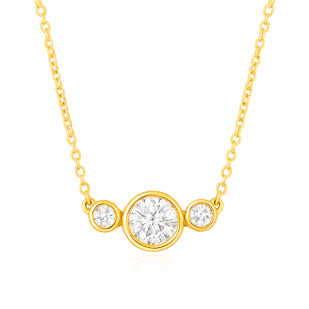 Classic, clean, and effortlessly elegant — this 14KT yellow gold necklace features a trio of bezel-set diamonds totaling .22ctw. The center diamond is slightly larger, flanked by two perfectly balanced side stones for a timeless three-stone look. Each diamond is encased in smooth, polished gold for maximum brilliance and a modern, minimalist finish. Suspended from an 18" chain, this necklace is perfect for everyday sparkle or sophisticated layering.