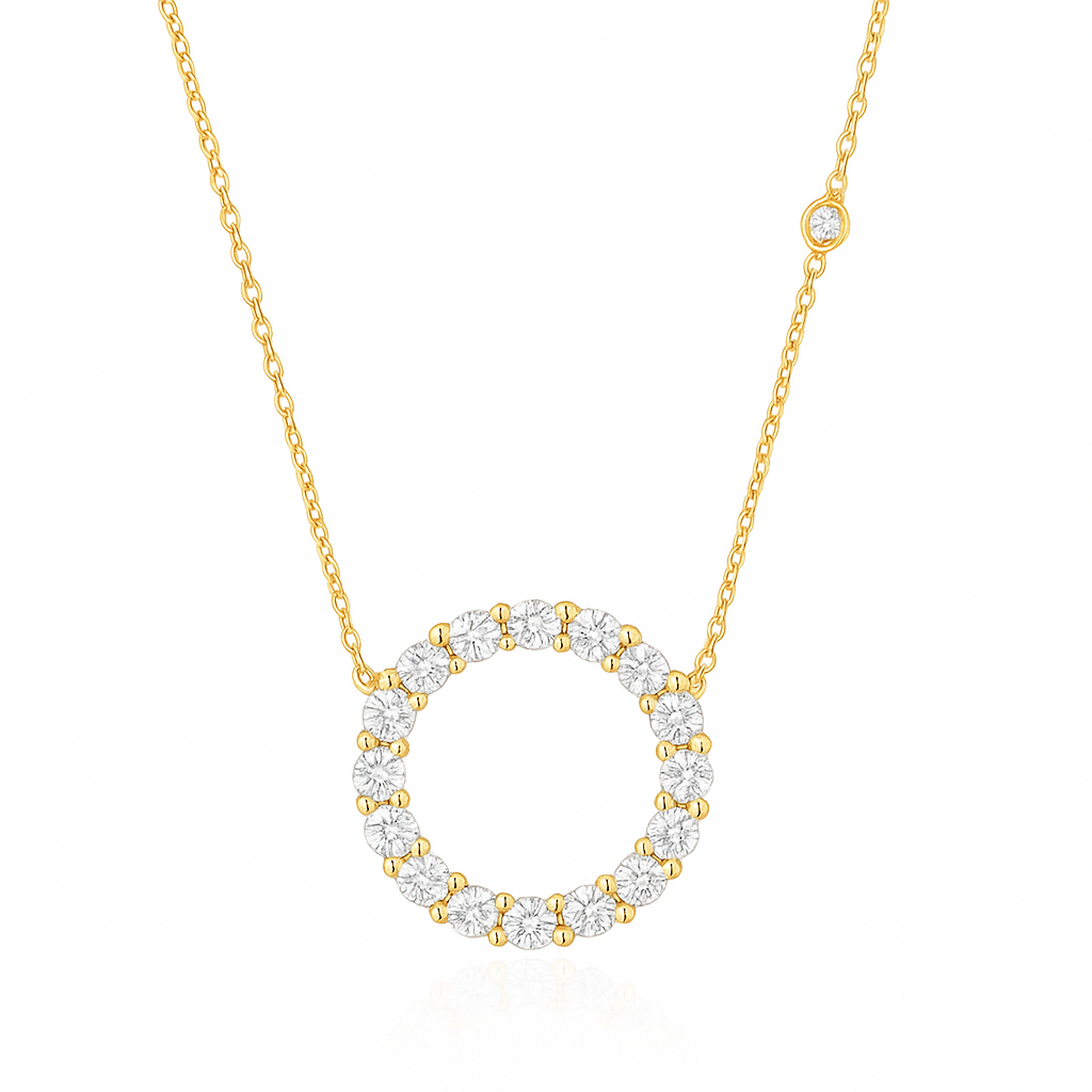 Bright, modern, and endlessly wearable, this 14KT yellow gold necklace features an open circle pendant set with .42ctw of sparkling round diamonds. Fourteen expertly matched round diamonds are prong-set in a continuous halo of brilliance, creating a chic symbol of eternity and wholeness. Suspended from an 18" chain, this diamond circle necklace is perfect on its own or layered with your favorite pieces for everyday shine.
