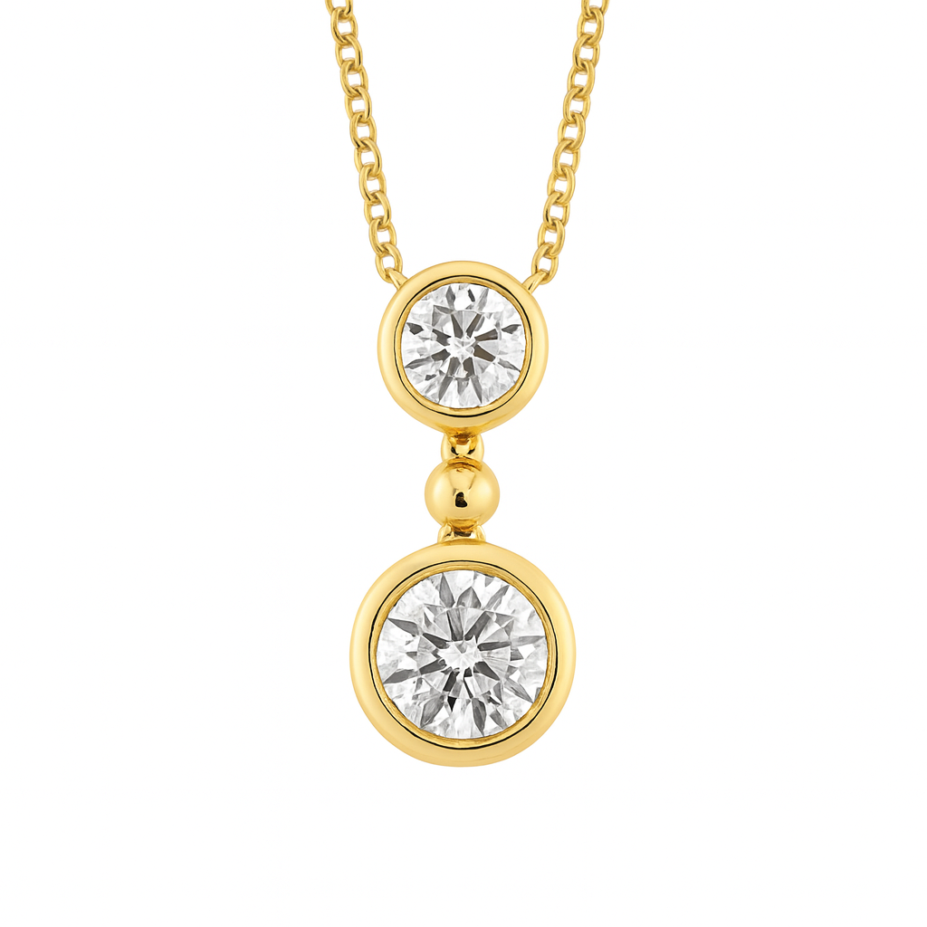 Classic, clean, and endlessly elegant — this 14K gold pendant features a double drop design with two bezel-set round diamonds totaling .46ctw. The top diamond adds a soft sparkle, while the slightly larger bottom diamond creates a luxurious cascading effect. A polished gold accent bead connects the two, giving the pendant graceful movement and modern appeal.
