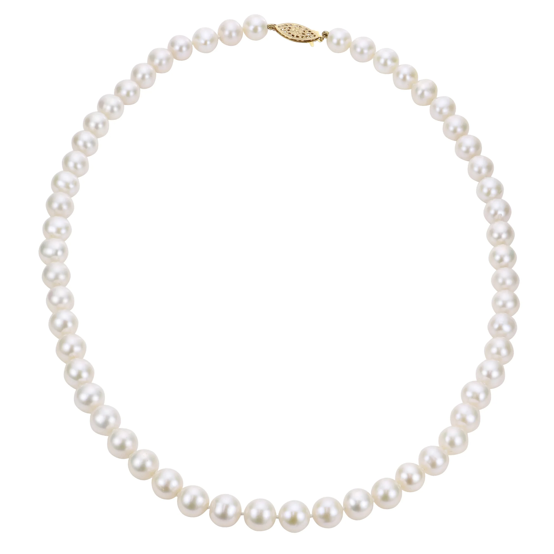 14Kt "AA" quality Freshwater cultured pearl strand. Strands have near round cultured pearls, beautiful luster, white color, and virtually no spotting. With a 14KT Yellow Gold clasp.