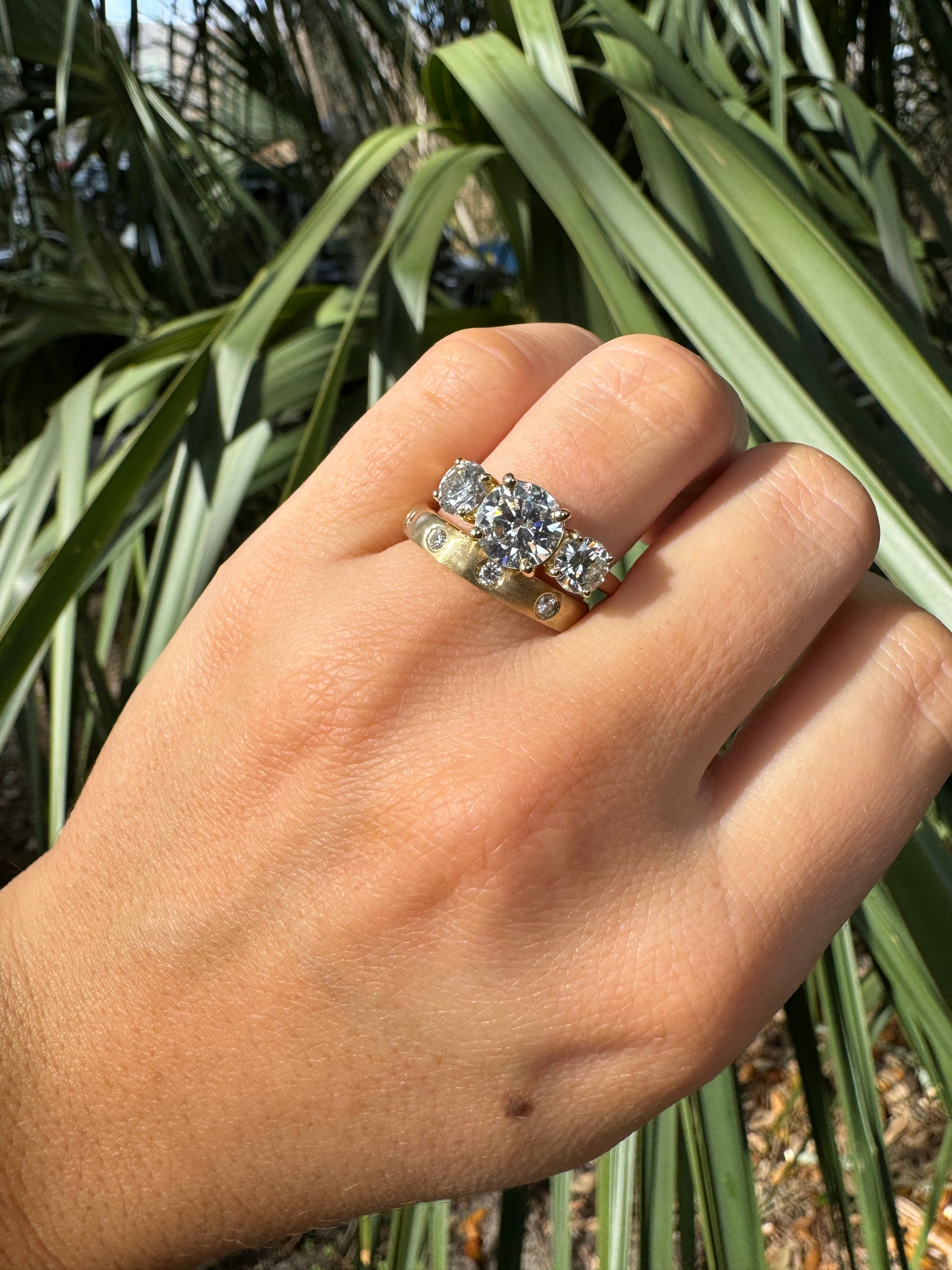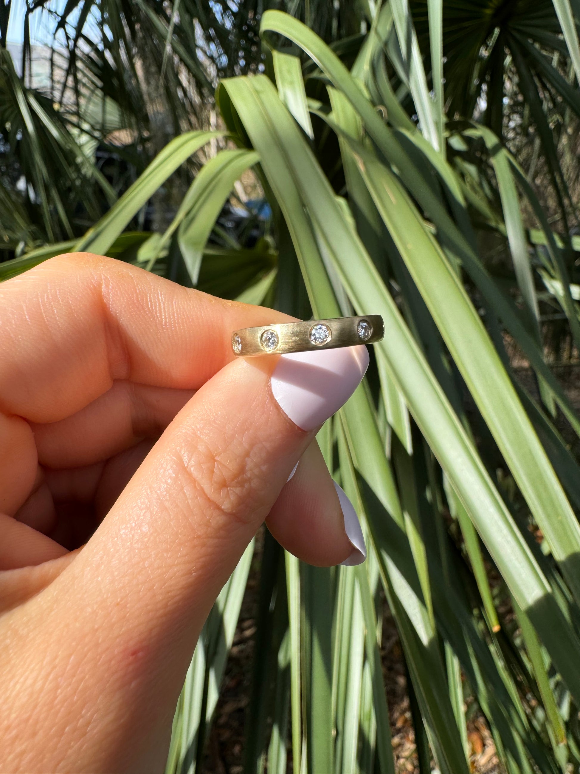 Mix and match this brushed gold diamond band with your other favorites! Featuring seven flush set diamonds this stackable band has a total of 0.31 carats total weight.