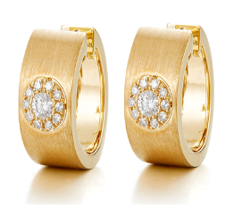 Crafted in rich 14K brushed gold, these wide huggie earrings exude understated luxury and modern edge. Each earring is adorned with .38 carats total weight of round pavé-set diamonds, adding a refined sparkle that catches the light beautifully. Designed for comfort and versatility, these huggies make an elegant statement on their own or paired with other earrings for a layered look.